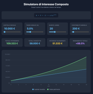# Calcolatore di Interesse Composto Uno strumento interattivo, gratuito e facile da usare per scoprire come cresce davvero il tuo denaro nel tempo grazie alla magia dell’interesse composto. ## A cosa serve Quanto vale davvero risparmiare 200 euro al mese per vent’anni? E se ne metti via 500? E se