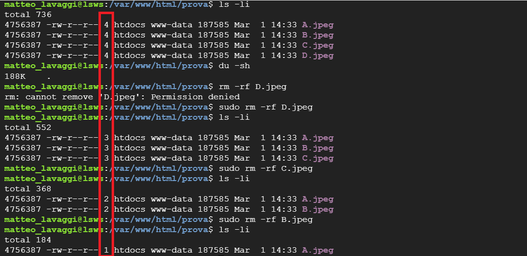 matteo_lavaggi@lsws:/var/www/html/prova$ sudo rm -rf D.jpeg matteo_lavaggi@lsws:/var/www/html/prova$ ls -li total 552 4756387 -rw-r--r-- 3 htdocs www-data 187585 Mar 1 14:33 A.jpeg 4756387 -rw-r--r-- 3 htdocs www-data 187585 Mar 1 14:33 B.jpeg 4756387 -rw-r--r-- 3 htdocs www-data 187585 Mar 1 14:33 C.jpeg matteo_lavaggi@lsws:/var/www/html/prova$ ls -li total 368 4756387 -rw-r--r-- 2 htdocs www-data 187585 Mar 1 14:33 A.jpeg 4756387 -rw-r--r-- 2 htdocs www-data 187585 Mar 1 14:33 B.jpeg matteo_lavaggi@lsws:/var/www/html/prova$ ls -li total 184 4756387 -rw-r--r-- 1 htdocs www-data 187585 Mar 1 14:33 A.jpeg
