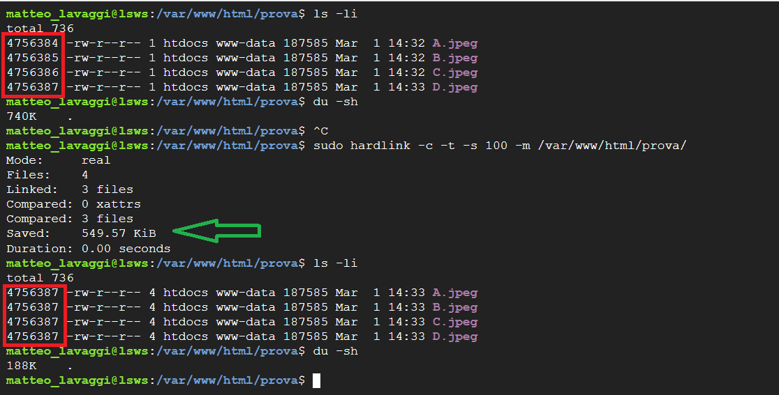 matteo_lavaggi@lsws:/var/www/html/prova$ ls -li total 736 4756384 -rw-r--r-- 1 htdocs www-data 187585 Mar 1 14:32 A.jpeg 4756385 -rw-r--r-- 1 htdocs www-data 187585 Mar 1 14:32 B.jpeg 4756386 -rw-r--r-- 1 htdocs www-data 187585 Mar 1 14:32 C.jpeg 4756387 -rw-r--r-- 1 htdocs www-data 187585 Mar 1 14:33 D.jpeg matteo_lavaggi@lsws:/var/www/html/prova$ du -sh 740K . matteo_lavaggi@lsws:/var/www/html/prova$ sudo hardlink -c -t -s 100 -m /var/www/html/prova/ Mode: real Files: 4 Linked: 3 files Compared: 0 xattrs Compared: 3 files Saved: 549.57 KiB Duration: 0.00 seconds matteo_lavaggi@lsws:/var/www/html/prova$ ls -li total 736 4756387 -rw-r--r-- 4 htdocs www-data 187585 Mar 1 14:33 A.jpeg 4756387 -rw-r--r-- 4 htdocs www-data 187585 Mar 1 14:33 B.jpeg 4756387 -rw-r--r-- 4 htdocs www-data 187585 Mar 1 14:33 C.jpeg 4756387 -rw-r--r-- 4 htdocs www-data 187585 Mar 1 14:33 D.jpeg matteo_lavaggi@lsws:/var/www/html/prova$ du -sh 188K .